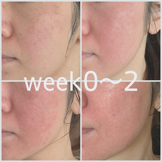 最初の2週間がとにかく辛かった…です。顔が赤くなり、熱をもっているような感じ。そして、セラピューティックプログラム特有の皮むけもありボロボロに…。メイクは基本的にできないもの、と覚悟が必要です。