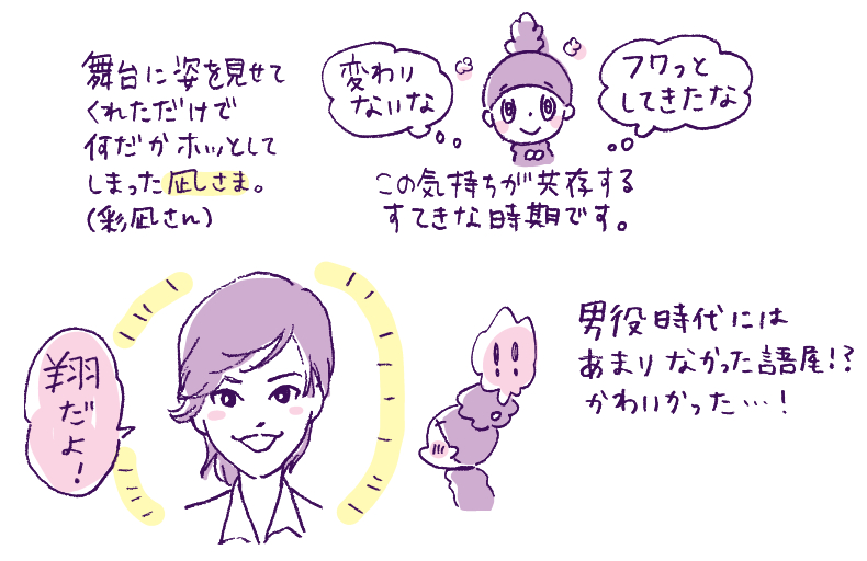 元宙組男役の星吹彩翔(ほしぶき・あやと)さんも見逃せません。歌、ダンス、お芝居、なんでもできて舞台のどこにいても目に留まる巧者ぶりは健在で、これまた中性的でありながら確かな存在感。出演場面は多くないながらも「あ、モンチさんだ!」と確実に余韻を残してくれます。
