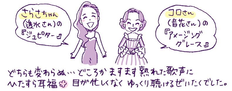 在団中と変わらぬ美しい歌声を聴かせてくれるのは、元星組娘役の音花ゆり(おとはな・ゆり)さんと元雪組娘役の透水さらさ(とうみ・さらさ)さん。おふたりとも、現役時代はエトワールの常連でしたよね。透水さんソロの『ジュピター』、音花さんソロの『アメイジング・グレイス』は、輝く声が耳にも心にも入ってきて浄化される感じ。