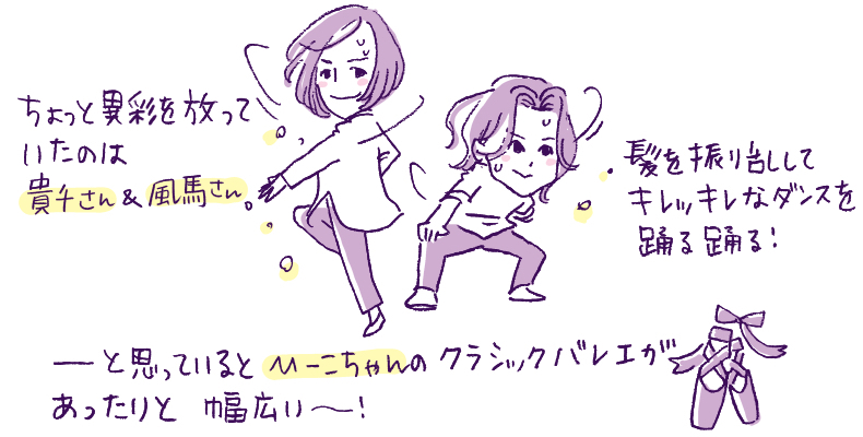 ストーリーテラー的な役を担っていたのは、現役時代からダンスに定評のあった元月組男役の貴千 碧(たかち・あお)さん 、元雪組娘役の笙乃茅桜(しょうの・ちお)さん、元宙組男役の風馬 翔(ふうま・かける)さんのスリーダンサーズ。貴千さんと風馬さんの“情”を感じるキレッキレのダンス、横分けの前髪がチャーミングな笙乃さんのスッとしたバレエベースのダンスなど、見どころがたくさん。宝塚歌劇の振付助手もしている風馬さんが、今公演でも部分的に振りを付けています。