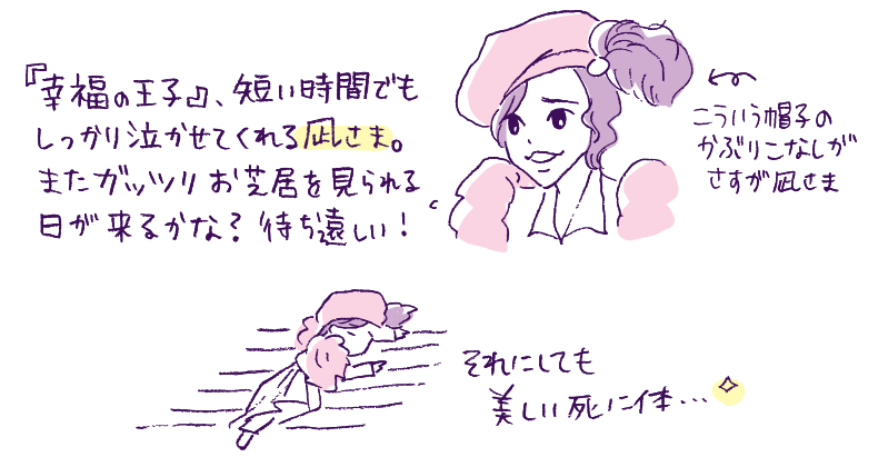 途中、『幸福の王子』が展開されてその切ないストーリーにキュッとしたり。彩凪さんの丁寧なお芝居が垣間見れて心を動かされ、先ほど触れた音花さんがソロで歌う『アメイジング・グレイス』で昇華…。