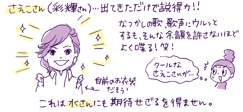 ショートカットに白い衣装の後ろ姿に「あれ、彩凪さんの影武者っぽい人が出てきたな」と思ったら、スペシャルゲストの彩輝なおさん。振り返った時のオーラはいまだ健在! 彩凪さんが憧れていたという彩輝さんとの共演&トークは、私たちにとってもレアな時間でした。彩凪さんが彩輝さんに歌ってほしいとリクエストした『ジャワの踊り子』。彩凪さんは練習の時に聴いて、号泣したとのこと。などなど、心温まることから爆笑ものまで、いくつかのエピソードを繰り広げてくれました。