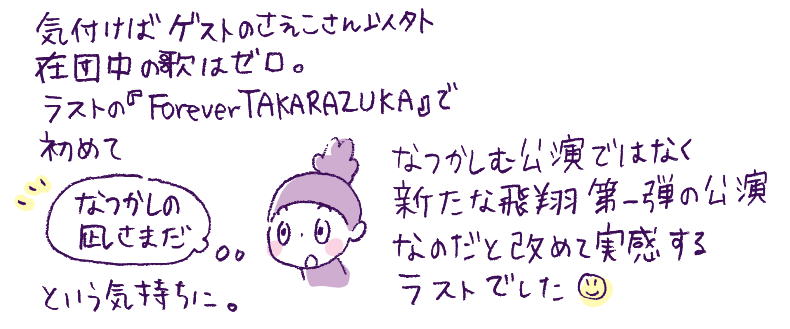 ふたりで一緒に『ドリーム・ガールズ』を歌い、その後出演者のみなさんを呼び入れて『Forever Takarazuka』を合唱。聴きなれた歌ですが、情緒を感じる入りから夢っぽいアレンジが新鮮。タカラヅカからタカラヅカ・ライブ・ネクストへの道があるから永遠なんだという意味にもとれて、これからさらにどんな舞台を展開してくれるのか期待が持てました。