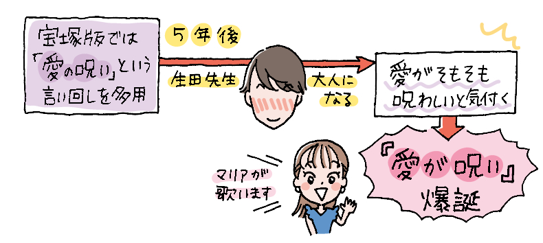 宝塚版では「愛の呪いに~」みたいなセリフ回しをしがちだったのですが、それから5年ほど経って自分も大人になりまして…(笑)、その結論として、“愛”そのものが呪わしいものなんだなと。だって自分の心ではどうしようもできなくて、コントロール不能なものであるから。そして『愛が呪い』という曲名になるわけですよ。