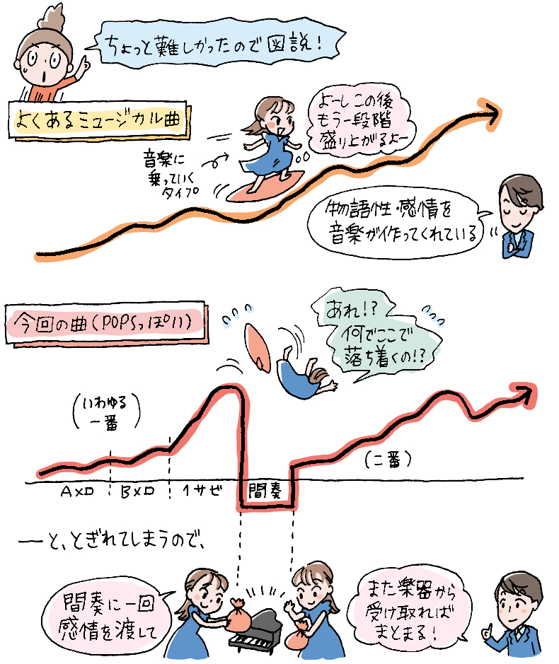 真彩:そう! 「あれ?、なんでここで落ち着くのよ!」みたいな。「いやいや、音楽的にはこれからもう一段階盛り上がるでしょ」って。…それでちょっと強行してしまうから、「(歌が)途切れてるよ」と注意を受けるんです。ワーッて歌った後にもう一度歌ったら、その間がブツ切れちゃうんですよね。