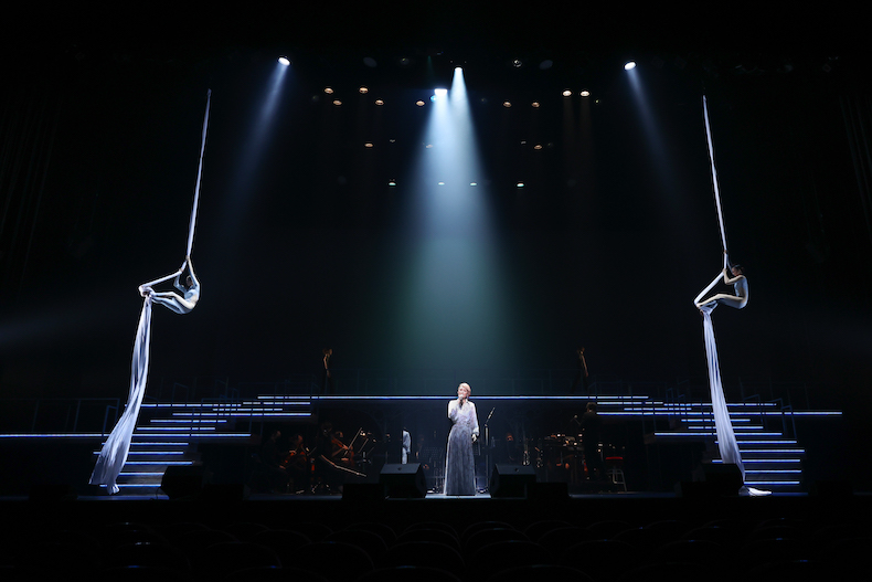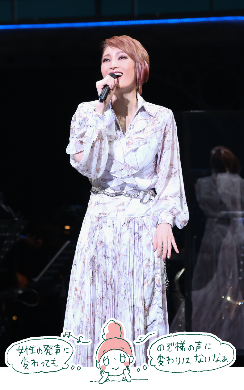 続く【J-POPサロン】では、誰もが聴き覚えのある4曲をピックアップ。特に印象深いのは『月光』。いい意味で肩の力が抜けて、でも丁寧で、歌うことを心底楽しんでいる感じでした。Gスペロケッツ(アクロバットダンスカンパニー「G-Rockets」の『SPERO』限定名)のエアリアルパフォーマンスはまるでシルク・ド・ソレイユのよう。美しく神秘的なムードを高めてくれます。望海さんの衣装は、大理石柄のワンピース…と思いきや、裾はパンタロン。そこに布が重なっていて、ロングワンピのように見えました。凛とした美しさがあり、それまた新たな魅力。