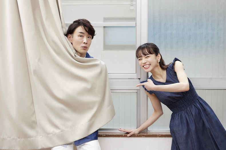 ▲カーテンを使って撮った取材陣のサンプル画像を見て、マネしてくれる生田さん。そしてそれを笑う真彩さんの「うしし」な表情(笑)。