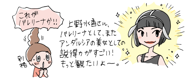 アンダルシアの美女を演じたのは、バレリーナの上野水香さん。しなやかなのに力強くて、出演場面は少ないながらもトップバレリーナの踊りは圧巻。長身で手足も長い水香さん。それがまた映えること! 強い男、ドン・ジュアンが「自分のモノにしたい」と思うのも納得。そんじゃそこらの男など相手にしない、という高嶺の花感がにじみ出ていました。