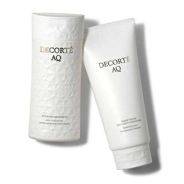 〈左から〉コスメデコルテ AQ リペア ボリューム シャンプー 250ml ¥3,850、同 リペア ボリューム トリートメント コンディショナー 250g ¥4,400