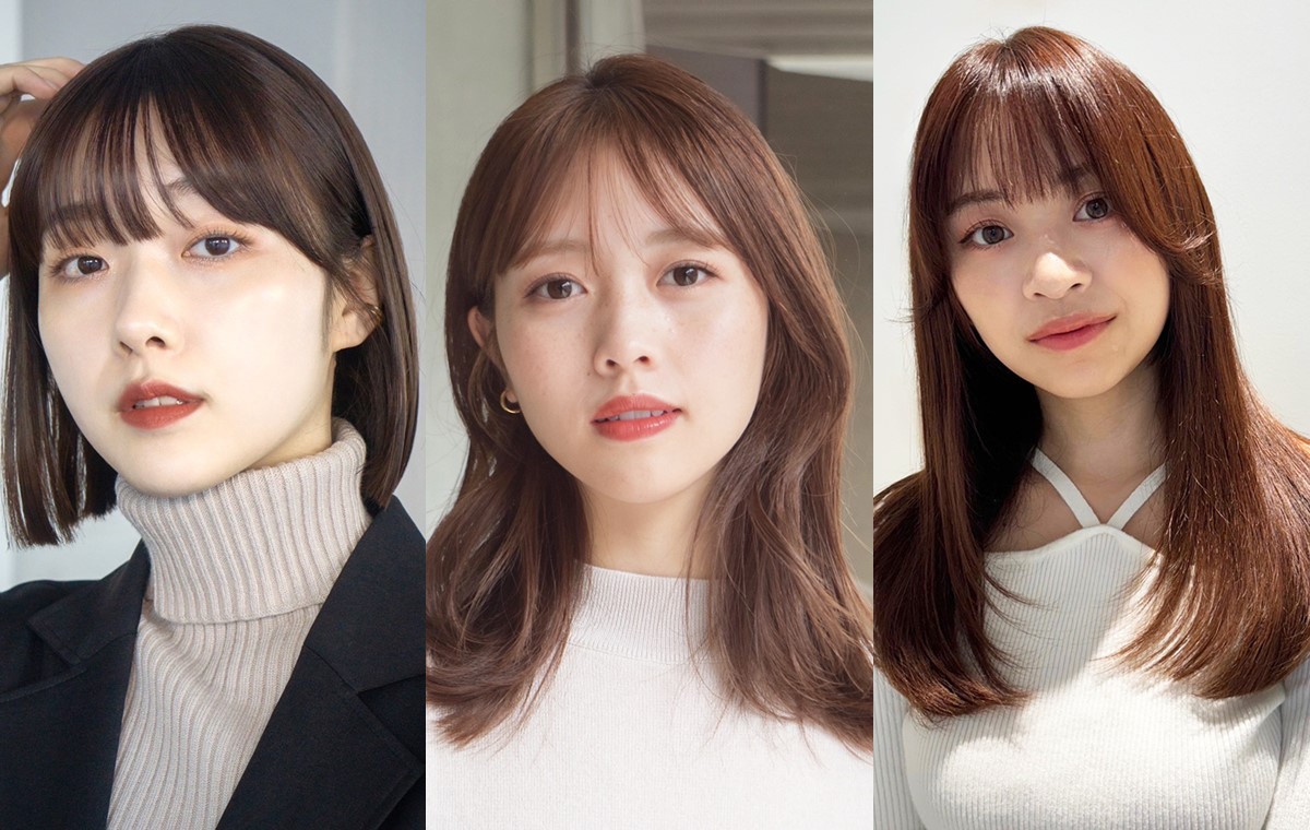 前髪は目にかからない長さのワイドバングで、サイドバングにかけてラウンドするようにつなげているため、柔らかい印象になっています。目の上、ギリギリラインの前髪は目力アップ効果も!