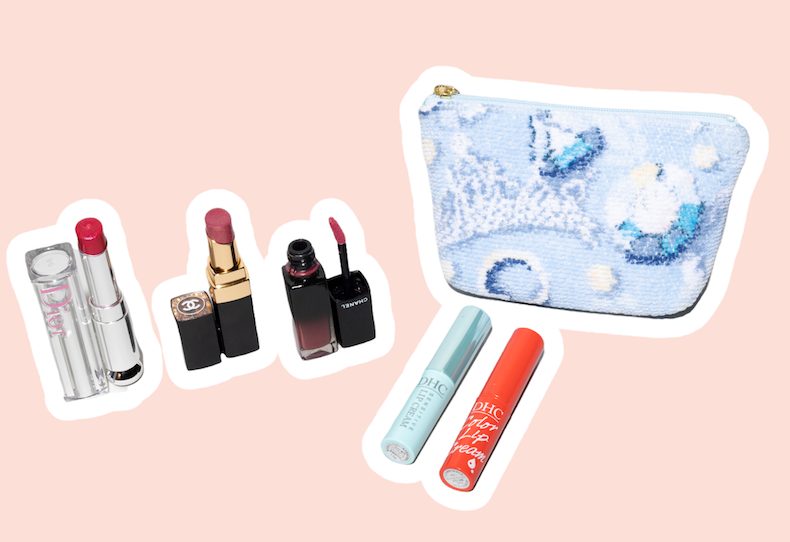 マスク生活のためいつもはリップクリームをつける程度ですが、人と会う時などに備えて口紅も持っています。ディオールの口紅は、今回のネイビーコーデの際につけました。青みがかった濃いめのピンクで、発色がいいです。シャネルの口紅は、ピンクにちょっとゴールドのラメが入っているためなじみがよく、普段使いにぴったりのマイルドなカラー。シャネルのリキッドリップは最近買ったもので、マスクにつきにくいのが特徴です。でもマットなわけではなく、ツヤっぽい唇になれます。