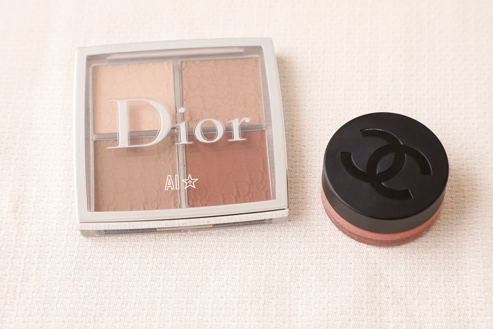 愛月:シェーディングはディオール。名前入りなんです。普段はあまり入れないのですが、撮影時にはメリハリと立体感を出すために使います。太めのブラシに左下と右上のカラーを取り、フェイスラインにサッと。シャネルのクリームカラーは、チークとリップに使えるもの。なじみのいいピンクベージュです。