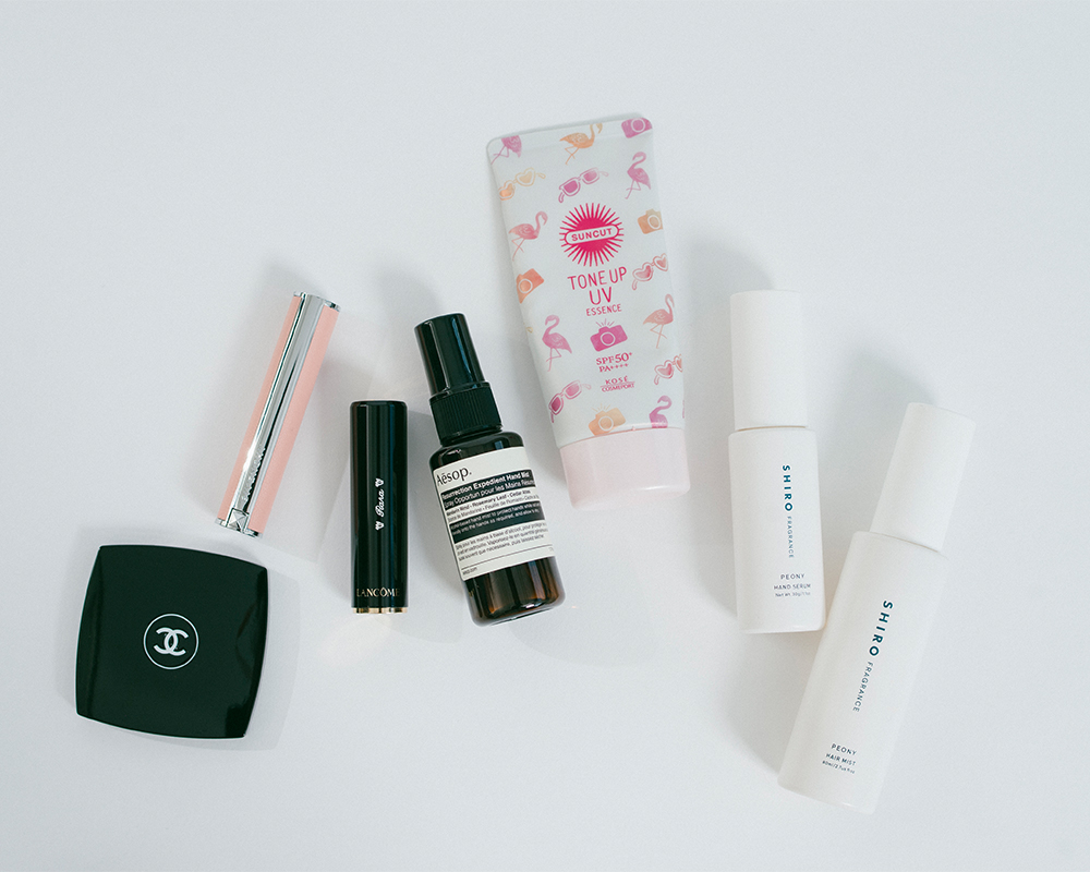 遥羽:シャネルのコンパクトミラーは長く使っているものです。普通の鏡と拡大鏡が両面についているので、メイク直しの時にとても便利。ジバンシイとランコムのバームはいただきもの。マスク生活のため、薄く色づくジバンシイのバームを塗り直すくらいでちょうどいいんです。ランコムのは口紅の下地としても使っています。ふたつとも、保湿ができて潤うのがお気に入り。イソップのハンドミストは必需品ですね。爽やかなアロマの香りで、使うたびに気分もよくなります。サンカットの日焼け止めを日中も塗り直しているのですが、いつの間にか焼けているんですよね。愛(愛月ひかる)さんは日焼け止めを塗っていないのにあんなに色白で…うらやましい(笑)! SHIROの中ではピオニーの香りが好きで、いろいろ集めていました。特にヘアミストは、在団中にカツラにも使って気分を上げていました、香水だとちょっと強いこともあり、髪にフワッと漂う程度のヘアミストがちょうどよくて。すっごくすきなのに、これ、なくなっちゃったんですよね…。残念です。