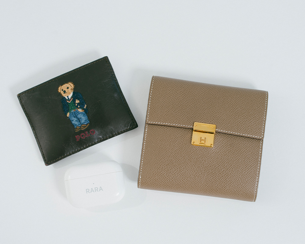 遥羽:左上のラルフローレンのカードケースにはSuicaを入れています。こちらはアウトレットで一目ボレ。かわいいですよね! 右上のお財布はエルメスのクリック12。卒業祝いとして購入しました。エトゥープという、落ち着いた大人っぽいカラーがどストライク。長財布だとバッグに入らないことがあるため、このくらいのサイズ感がちょうどいいです。正方形なのも珍しくて好き。左下のAirPodsは同期から2年前くらいにもらった誕生日プレゼント。名前を入れてくれたんです。