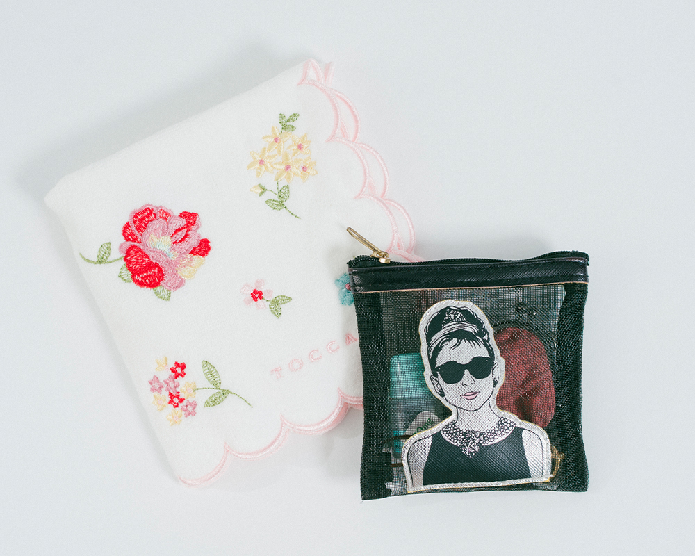 遥羽:夢のあるかわいい世界観が大好きなTOCCAのアイテムは在団中からお世話になっています。このミニタオルもスカラップが愛らしくて♡ 右のポーチは、アクセサリーや目薬などを入れています。コンパクトにまとめられて便利です。