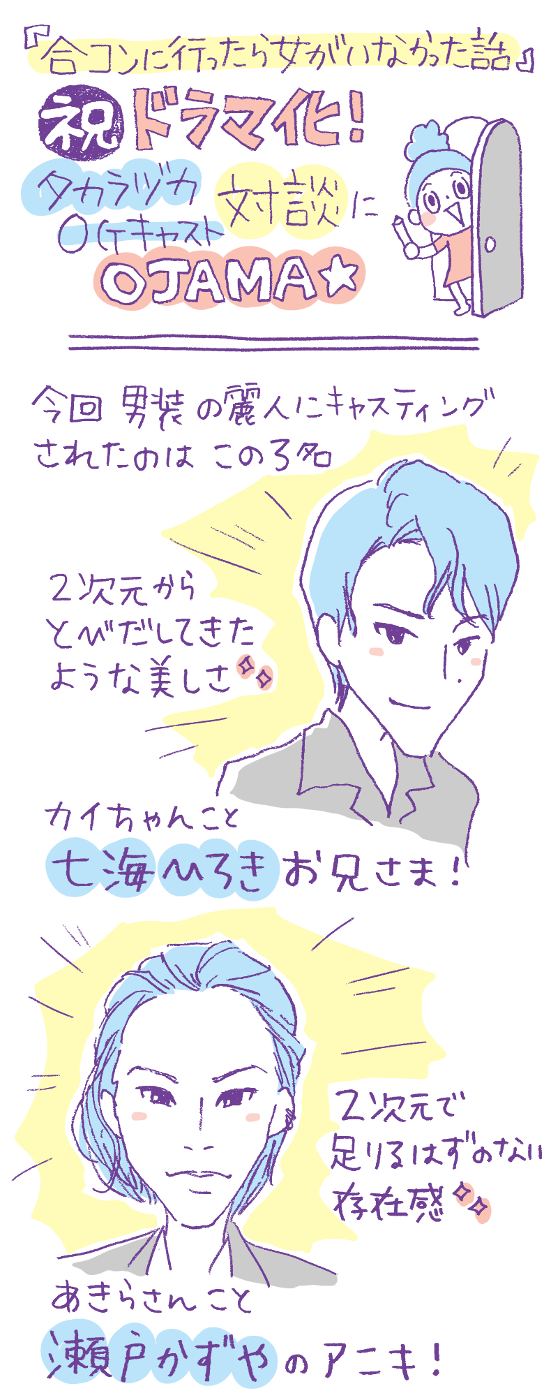 そんな時、常盤のスマホにメッセージが届く。なんと、同じ講義をとっている大学院生の蘇芳(スオウ/七海ひろき)からの合コンの誘いだった!ドキドキしながら、合コンにやってきた常盤&浅葱&萩。「どんな女の子なんだろう?」とソワソワしながら店内へ。しかし、そこにいたのは超絶キラキラオーラをまとったイケメン3人、蘇芳&藤(フジ/瀬戸かずや)&琥珀(コハク/如月 蓮)でーー。