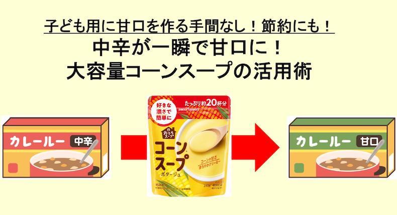 「お家で中辛派と甘口派に別れたとしても、中辛にコーンスープを混ぜるだけで甘口になります。わざわざ甘口をつくる必要がないので、時短になりますよ。少しづつ混ぜ合わせれば好みの甘さに調整できるので、お子さんの年齢や好みに合わせてコーンスープの分量を変えてみてください」(酒井さん)