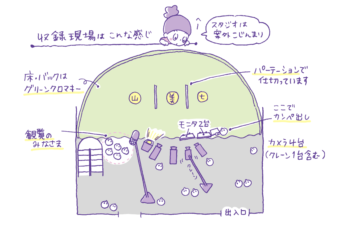 スタジオに入ると、一面が緑の布(クロマキー)に。あとから編集で、オンエアで流れたような劇場風の背景が入ってくるんですね。下手側から、山里さん・美弥さん・七海さんの順に、かなり距離をとって座られていました。