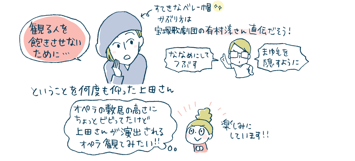 この日は黒のベレー帽を素敵にかぶって登場してくれた上田さん。ベレー帽の被り方は、宝塚歌劇団の衣装デザイナーの有村 淳さんから直々に教えてもらったそう。「これよりひとつ大きいサイズを買ったらどうかぶっていいかわからなくて。結構難しいんですよ。そしたら有村さんが、『眉尻がちょっと隠れるように斜めに被って少しつぶすといい』と教えてくださったんです」。とてもよくお似合いでした!