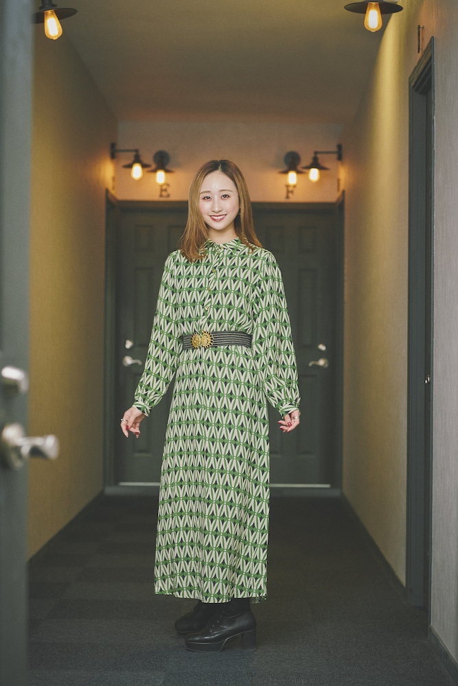 音:このワンピースもザラです。ヴィンテージテイストを選ぶことが多くて、これも見つけた瞬間にピンときました。グリーンも好きなんですよね。付いていた共布のベルトは使わず、太いベルトで締めています。体型がストレートのため、メリハリのある着こなしをするように心がけているんです。足元は編み上げの黒ブーツにして、辛口な印象に仕上げました。