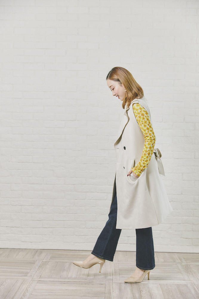 音:スエードっぽい素材のトレンチベストはザラのもの。合わせやすそうだなと思って、5分くらい考えて買いました。買い物は迷って結局買わない場合もありますが、ピンとくるものは絶対に大丈夫だという確信があって、カットソーもベストもそのタイプだったんです。ユニクロの細身のデニムでカジュアル感をプラスしつつ、きれいめパンプスで品のよさも忘れずに。