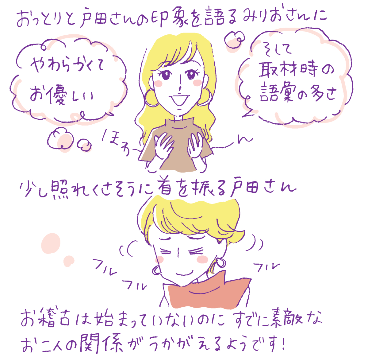 撮影/風香 スタイリング/江島モモ(戸田さん分)、大沼こずえ(明日海さん分) ヘア&メイク/相場広美(MARVEE/戸田さん分)、山下景子(明日海さん分) イラスト/春原弥生 構成・文/淡路裕子