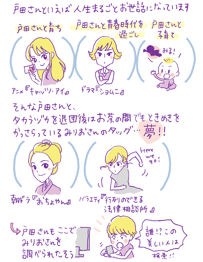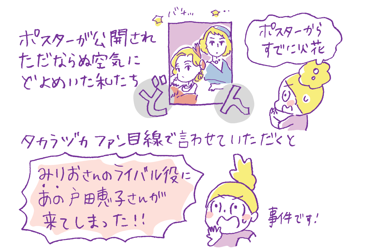 戸田さん(以下敬称略):ありがとうございます。私は宝塚歌劇のことをあまりよく知らなかったんです。退団された方とお仕事をすることがあるから、まったく知らないわけではなかったんですけどね。で、朝ドラ(NHK連続テレビ小説)の『おちょやん』を見ていて、「あら、キレイな人が出てる」とすごくインパクトがあり、調べたら明日海りおさんだったの。そこから動画とかネットとかをいろいろ見て、佇まいと貫禄がとっても素敵だなと思っていたんです。