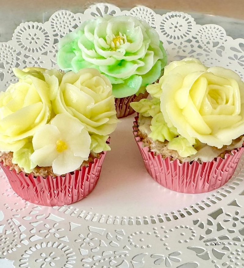 朝月さん(以下敬称略):最近フラワーケーキを始めたんです。ずっとあんフラワーをやってみたいなと思っていたので、あんこをバタークリームに変えて。バタークリームを円で絞ってお花のようにしていく方法で、ケーキやカップケーキに装飾します。練習で絞ったクリームはパンにのせてもかわいいんですよ。