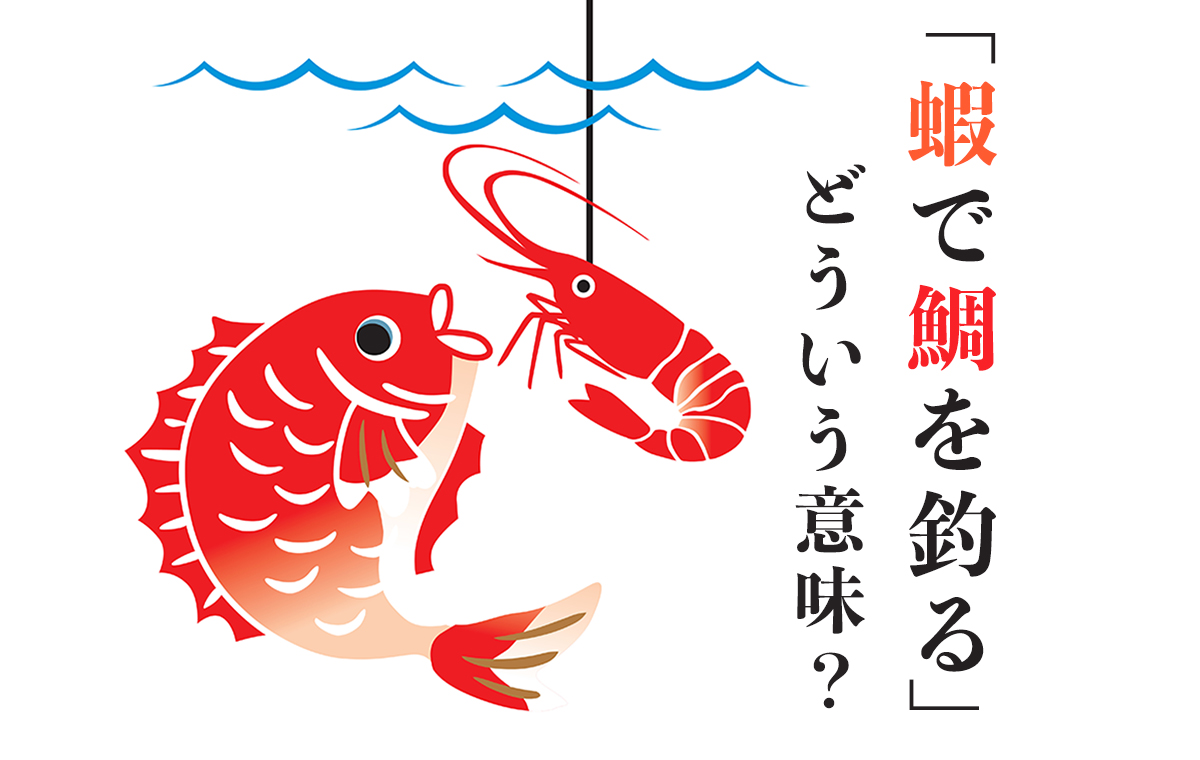 「蝦で鯛を釣る」とは、「小さな労力や、少しの手元で多くの利益を得ること」をいったことわざです。略して「えびたい」や、「蝦で鯛」などといわれることもあります。