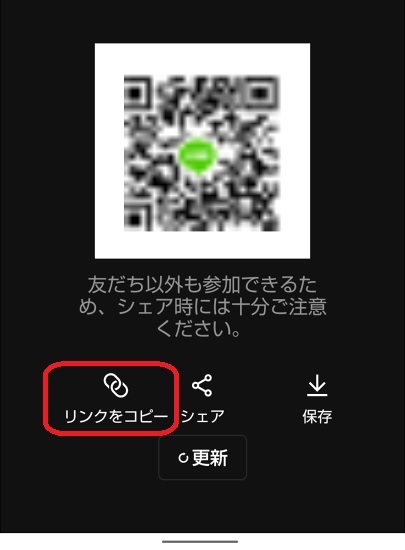 選択中の画面で「招待リンク」をクリックします。QRコードと同じ画面になりますが、「リンクをコピー」を選択すれば、招待用のURLを発行できます。LINEだけでなく、SMSやメール、SNSのDM(ダイレクトメッセージ)などでも送ることが可能です。