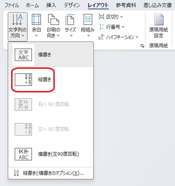 用紙の設定後、文字列の方向を「縦書き」にしておきましょう。