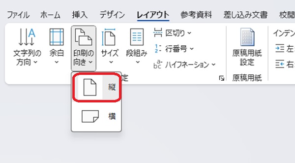 次に、印刷の向きを設定します。縦書き用の場合、「縦」に設定するのが一般的です。