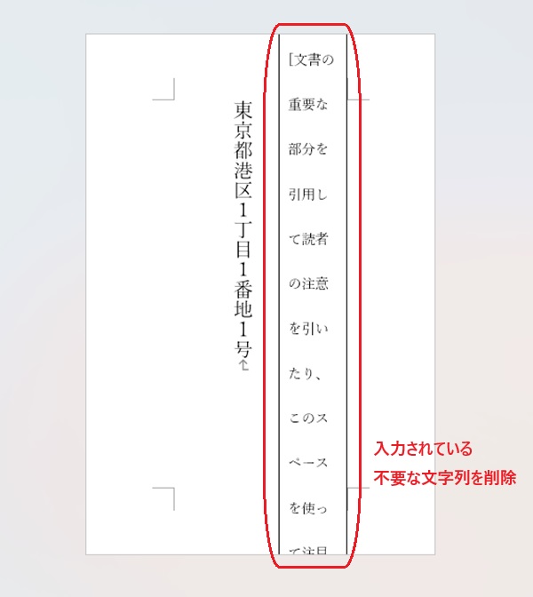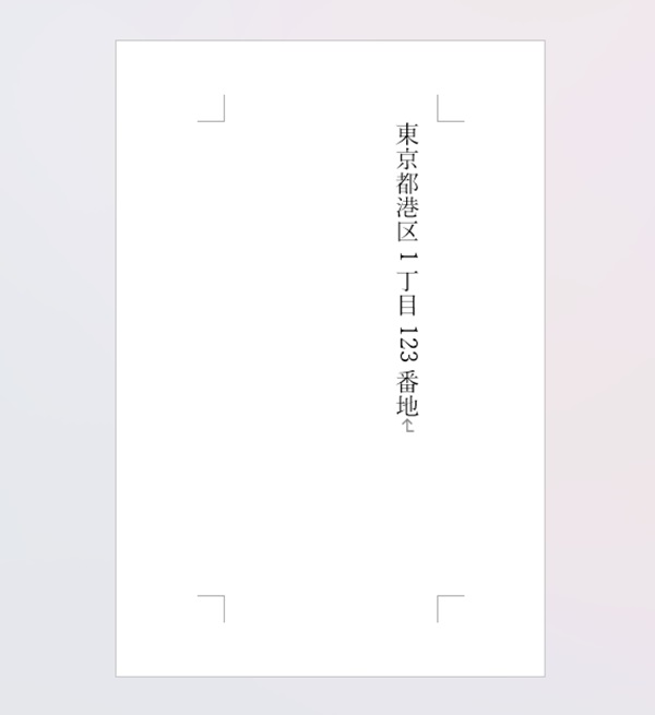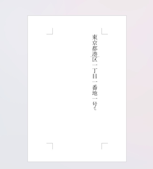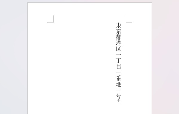 ただし、漢数字の使用によって住所が読みづらくなる場合は、全角数字の使用がおすすめです。全角数字を使うと、以下のように特別な設定をしなくても縦書きに設定されます。
