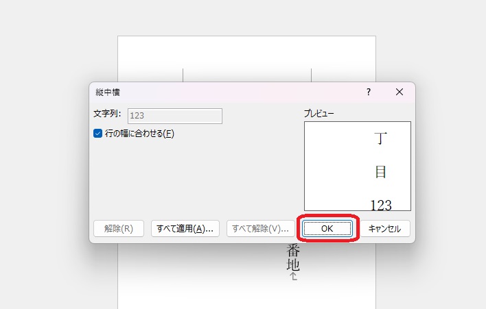 半角英字・半角数字を使用したいときは、「縦中横」機能が使えます。例として、丁目・番地を縦書きにするケースを見ていきましょう。