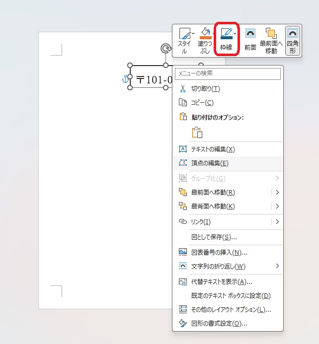 はがきや封筒に郵便番号を入力したいときは、以下の手順で設定しましょう。例としてテキストボックスを使う方法を紹介します。