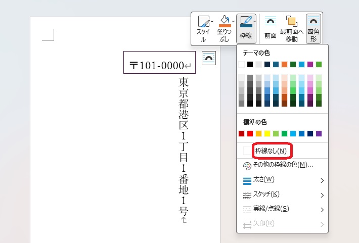 3.マウスを右クリックし、「枠線」のメニューから「枠線なし」を選び、外側の線を消す