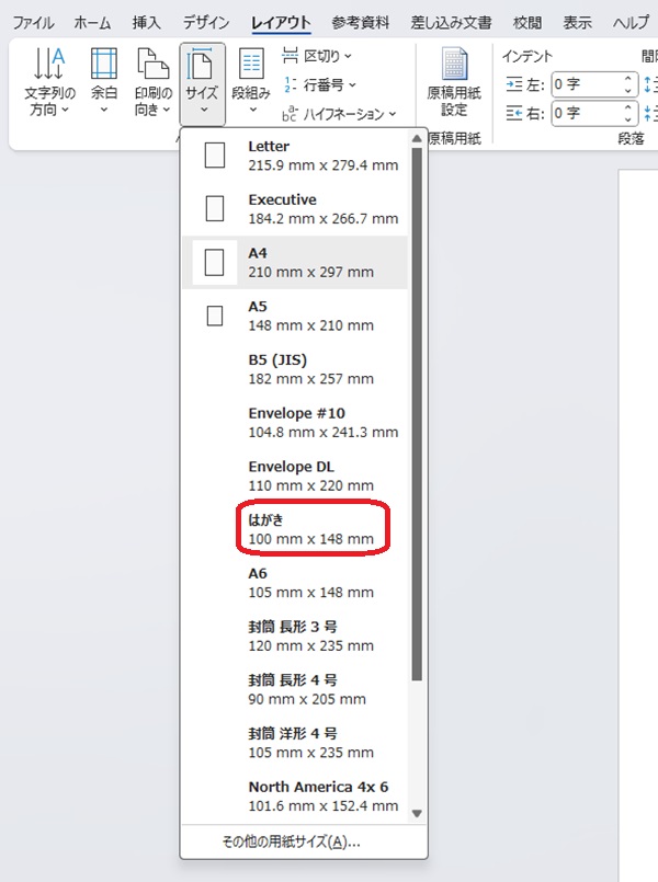 1.「レイアウト」から「ページ設定」、「サイズ」を選択し、用紙サイズを「はがき」に設定する(はがきサイズがない場合は、100×148mmに設定)