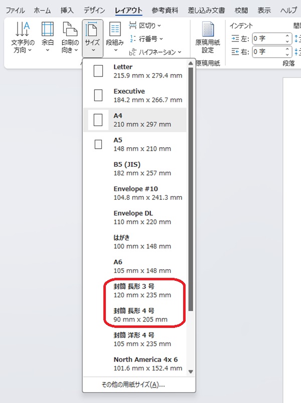 次に、用紙のサイズを封筒サイズに設定します。縦書き向けの種類には「長形3号」「長形4号」がありますが、他の種類を使いたい場合は別途「その他の用紙サイズ」から手動で設定しましょう。