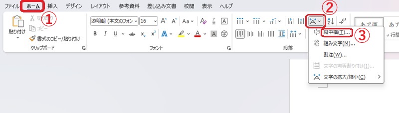 ホームタブ内の段落タブ内に、「拡張書式」があります。拡張書式の中にある「縦中横」機能を使いましょう。