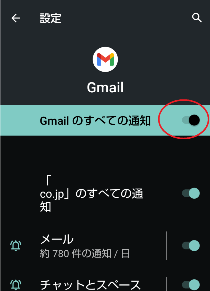 ここで、青い背景色の入っている「Gmailのすべての通知」がオフになっていないかを確認します。オフになっている場合はメールは届かないので、オンに設定し直しましょう。