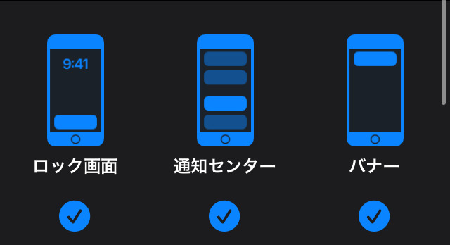 通知設定は、通知の表示場所を、ロック画面・通知センター・バナーからいくつか選べます。