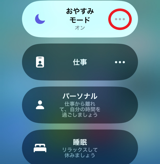集中モードがオンになっていないか確認しましょう。オンになっているモードがあれば、その横の「メニュー」マークをタップしてください。