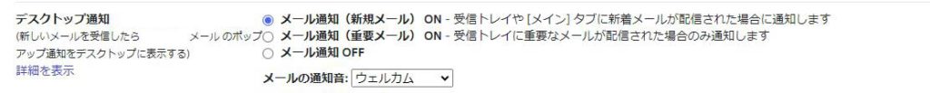 以下の項目で、「メールを通知」を選択します。すると、新しいメールが来たときに、PCに通知されるようになります。