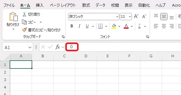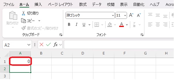 下の画像の場合、A1のセルを選択すると、数式バーには「0」と表示されているので、入力自体はできているはずです。