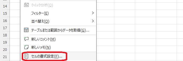 セルを選択した状態でマウスを右クリックすると、メニューが出てきます。「セルの書式設定」をクリックしましょう。