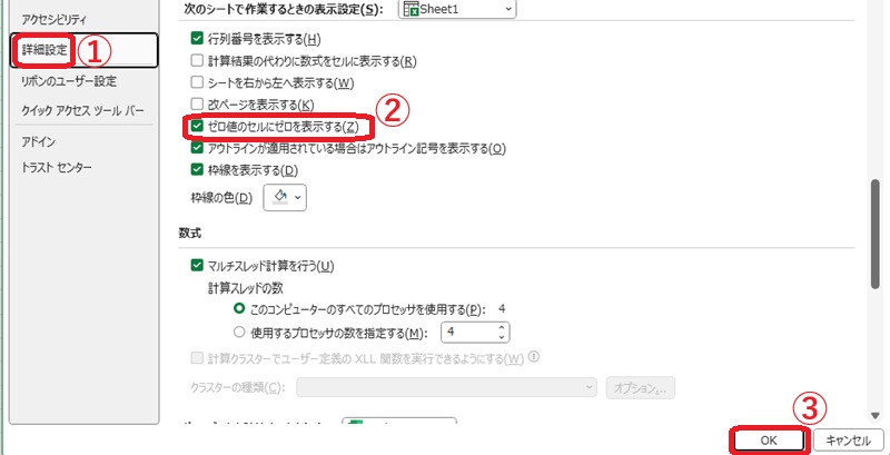 詳細設定の中に、「ゼロ値のセルにゼロを表示する」という項目があるため、チェックを入れます。最後に、「OK」をクリックして設定を反映させましょう。