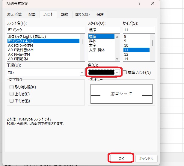 シートの色と文字色が同じになっているため、変更しましょう。色のプルダウンから、変更したい色を選んで、設定します。下の画像では、黒を選択した状態です。「OK」をクリックすると、設定が反映されます。