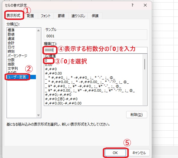 4.種類から「0」を選択し、表示させたい桁数分の「0」を入力する