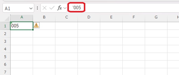 数字の前にアポストロフィー(’)を入力すると、先頭の0が表示されるようになります。下画像を見ると、数式バーにアポストロフィーが入力されていますが、シート上の数値には表示されません。