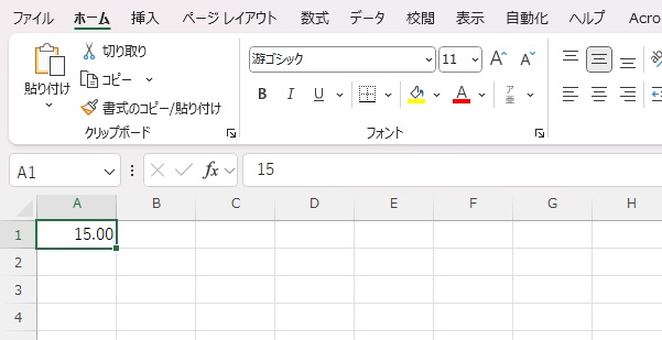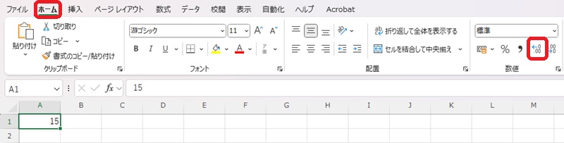 「小数点以下の表示桁数を増やす」アイコンを2回クリックすると、15.00と表示されます。
